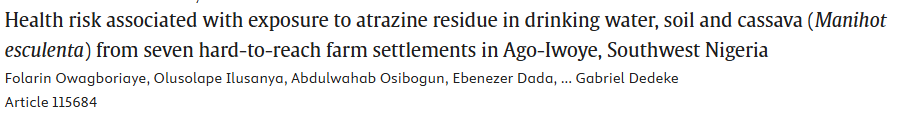 10.七个难以到达的农场定居点中饮用水、土壤和木薯中残留的阿特拉津暴露健康风险评估:来自尼日利亚阿戈-伊沃耶的研究