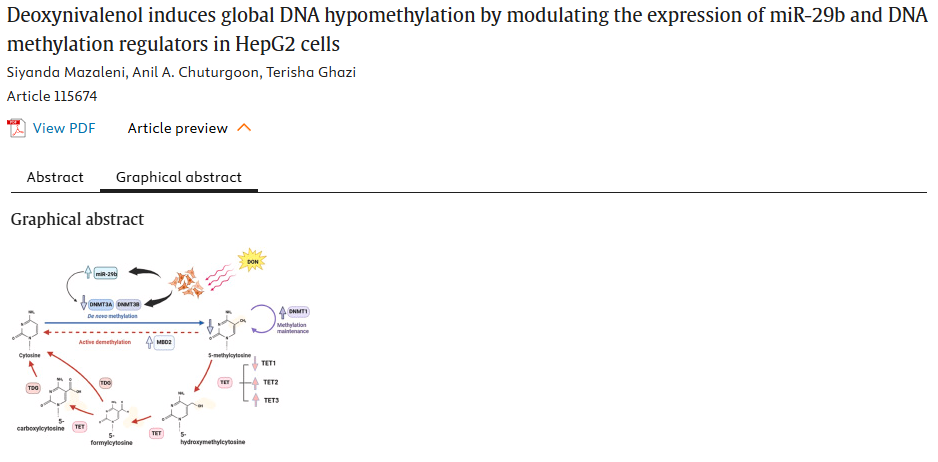 概述:脱氧雪腐镰刀菌烯醇(DON)通过调节miR-29b和DNA甲基化调节因子,诱导HepG2细胞的全基因组DNA低甲基化。DON上调了DNMT1和miR-29b的表达,下调了DNMT3b和TET1的表达,可能促进基因组不稳定性,进而推动癌症的发生和进展。