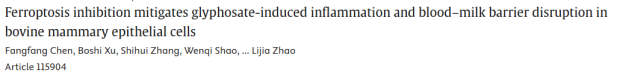 概述:利用牛乳腺上皮细胞模型,发现草甘膦诱导铁死亡特征,并破坏紧密连接蛋白致血-乳屏障损伤,铁死亡抑制剂Fer-1显著缓解炎症及屏障破坏,揭示铁死亡为乳腺毒性防治新靶点。