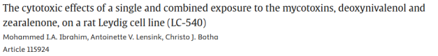 概述:利用LC-540细胞模型,发现脱氧雪腐镰刀菌烯醇较玉米赤霉烯酮毒性更强,低浓度联合呈协同效应而高浓度拮抗,两者均破坏细胞骨架及线粒体结构,诱导自噬与凋亡,为真菌毒素雄性生殖毒性机制提供体外证据。