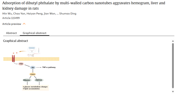 概述:多壁碳纳米管(MWCNTs)吸附邻苯二甲酸二丁酯(DBP)后可显著增强其毒性,通过诱导氧化损伤促进炎症因子释放及代谢蛋白异常表达,加重大鼠血象异常及肝肾损伤。