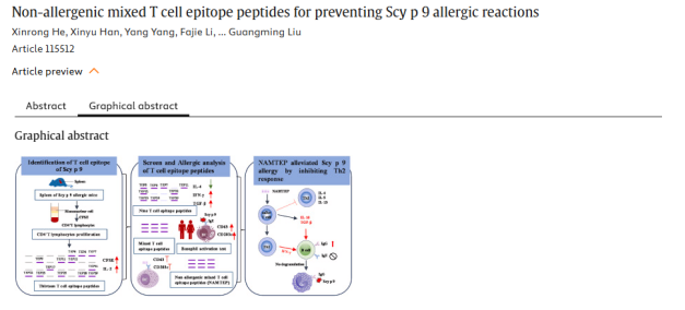 概述:基于小鼠实验与患者检测,非致敏性混合T细胞表位肽被证实具有非致敏性并能抑制Th2反应,有效预防Scy p 9过敏,为甲壳类水产品过敏防控提供新思路。