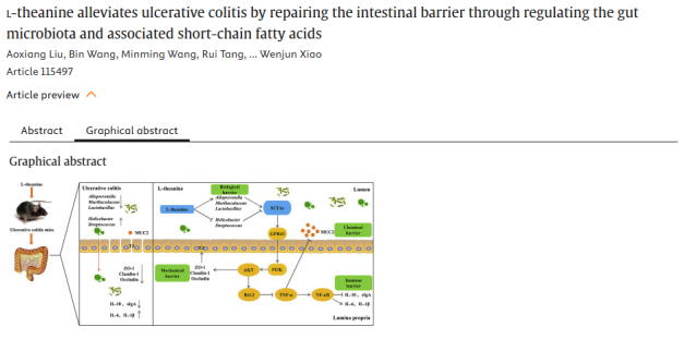 概述:小鼠粪菌移植实验发现l-茶氨酸通过激活GPR43/PI3K/AKT信号通路,优化肠道菌群结构与提高短链脂肪酸水平,从而修复肠屏障并缓解溃疡性结肠炎(UC)。本研究为l-茶氨酸作为安全膳食补充剂在UC防治中的应用提供了新思路。