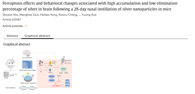 概述:小鼠经鼻暴露银纳米颗粒后,银在海马蓄积,引起学习记忆障碍和神经元损伤,并通过铁死亡途径介导持续性神经毒性。