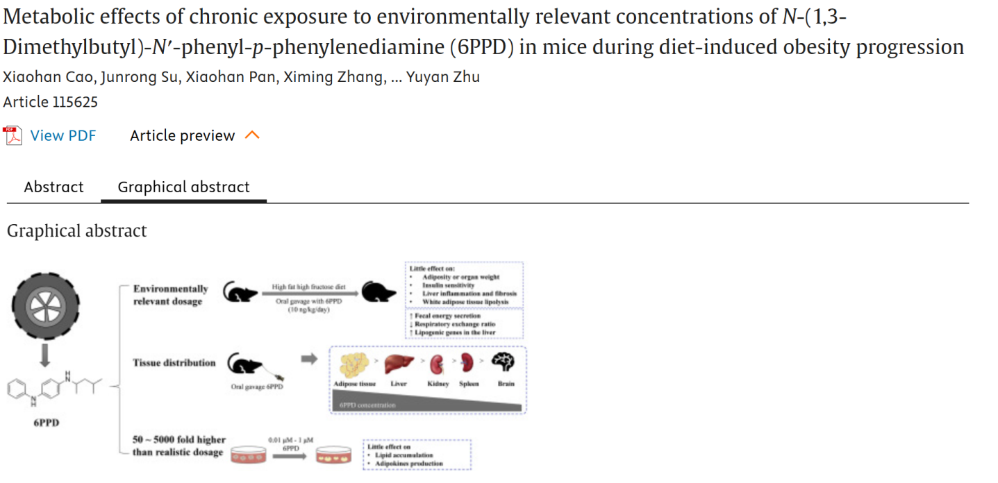 概述:通过在高脂高果糖饮食下暴露小鼠于环境相关浓度的6PPD,发现6PPD对代谢健康的影响有限,主要表现在消化系统上的轻微影响,并未对脂肪积聚、能量消耗或胰岛素耐受性造成显著改变。