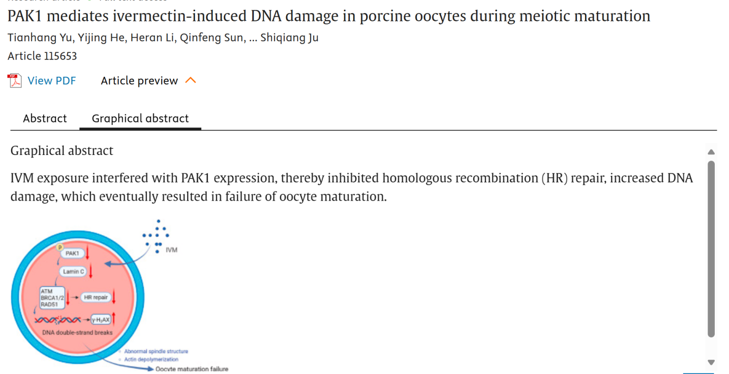 概述:伊维菌素(IVM)暴露抑制猪卵母细胞的减数分裂成熟并引起DNA损伤。PAK1通过调节DNA同源重组修复,介导IVM诱导的DNA损伤,且PAK1过表达可缓解这些不良效应,但HR修复抑制剂Mirin可逆转此效应。