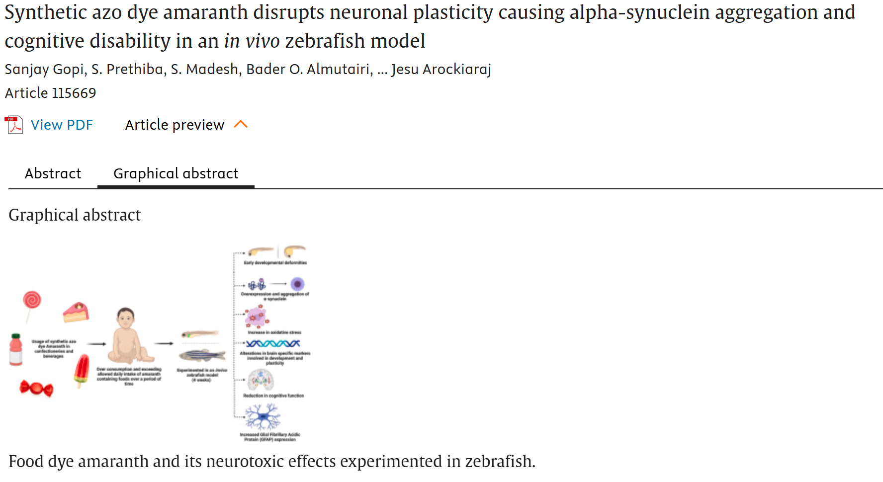 概述:通过斑马鱼模型,研究发现胭脂红在环境相关浓度下可导致氧化应激、神经可塑性破坏,并通过α-突触核蛋白聚集引发认知障碍和运动行为改变。