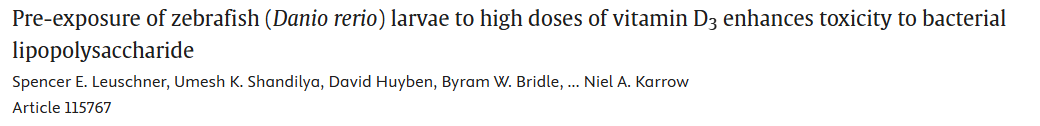 概述: 通过将斑马鱼幼鱼暴露于高剂量维生素D3,并施加细菌脂多糖(LPS)免疫挑战,发现维生素D3预处理会显著加剧LPS的致死效应并调控代谢酶表达,增强免疫应激下的毒性风险。
