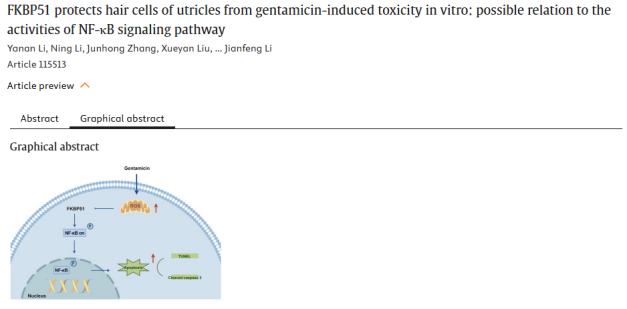 概述:FKBP51缺失导致小鼠椭圆囊毛细胞 (HCs)损伤加重,而N-乙酰-L-半胱氨酸 (NAC) 可部分缓解。机制研究表明,FKBP51可能通过抑制NF-κB通路保护HCs免受庆大霉素毒性。