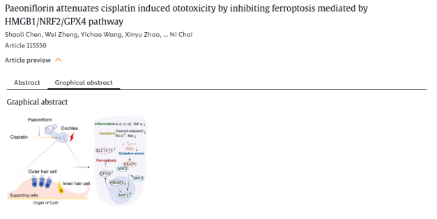 概述:芍药苷通过下调HMGB1并激活NRF2/SLC7A11/GPX4通路,抑制铁死亡,从而缓解顺铂诱导的耳蜗损伤与听力下降。