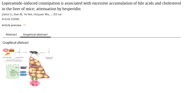 概述:橙皮苷通过减少肝脏胆固醇积累和促进胆汁酸排泄,缓解了洛哌丁胺引起的便秘。其作用机制涉及对胆固醇/胆汁酸合成酶和转运蛋白的协调调节。
