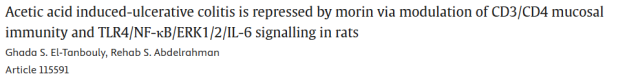 9. 醋酸诱导的溃疡性结肠炎通过莫林调节CD3/CD4黏膜免疫和TLR4/NF-κB/ERK1/2/IL-6信号通路在大鼠中的抑制作用